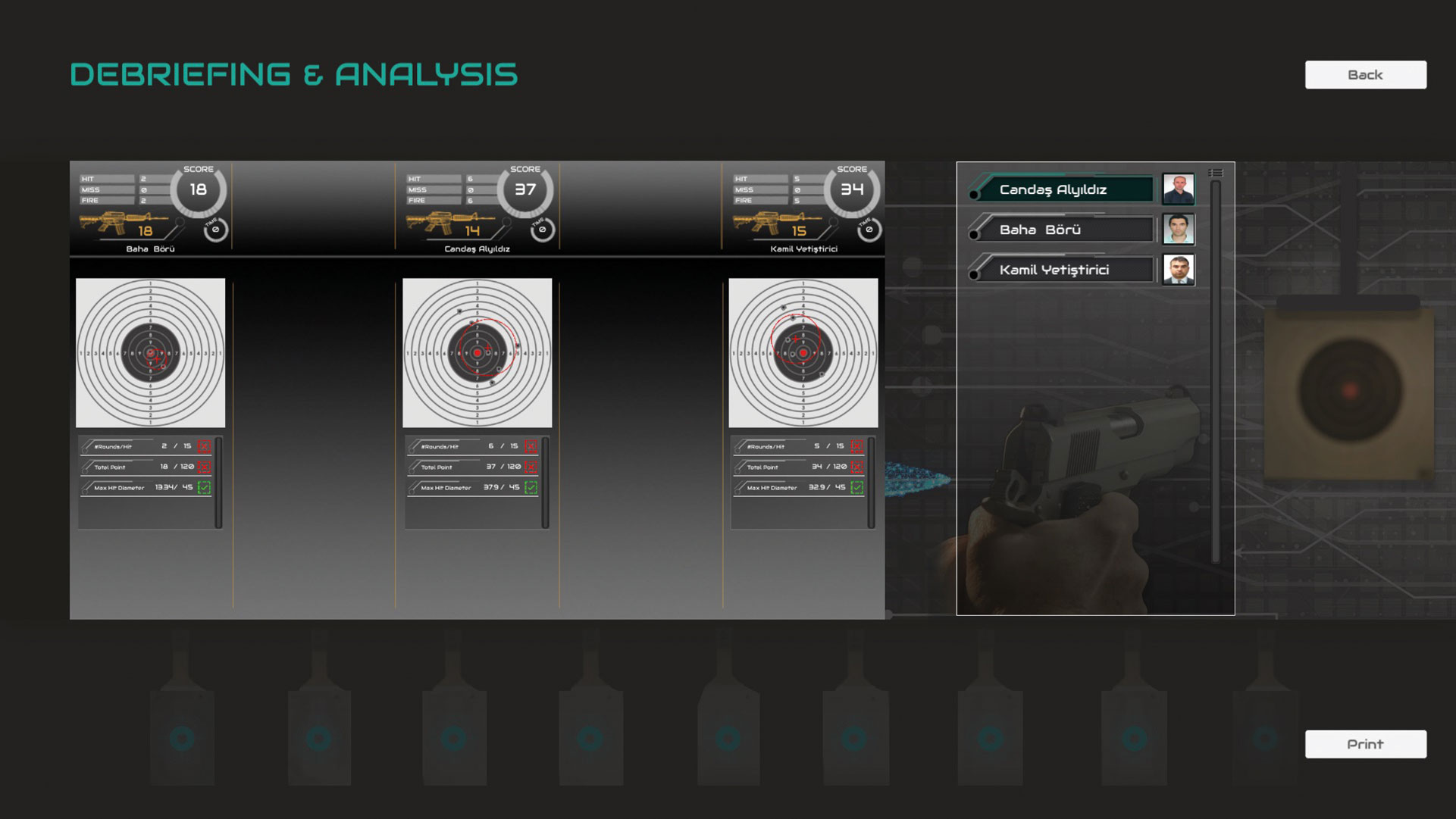 Lists each trainee accomplishment status with visual aids and success criteria pass/failed results