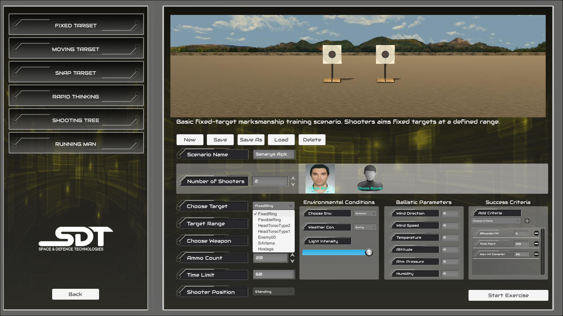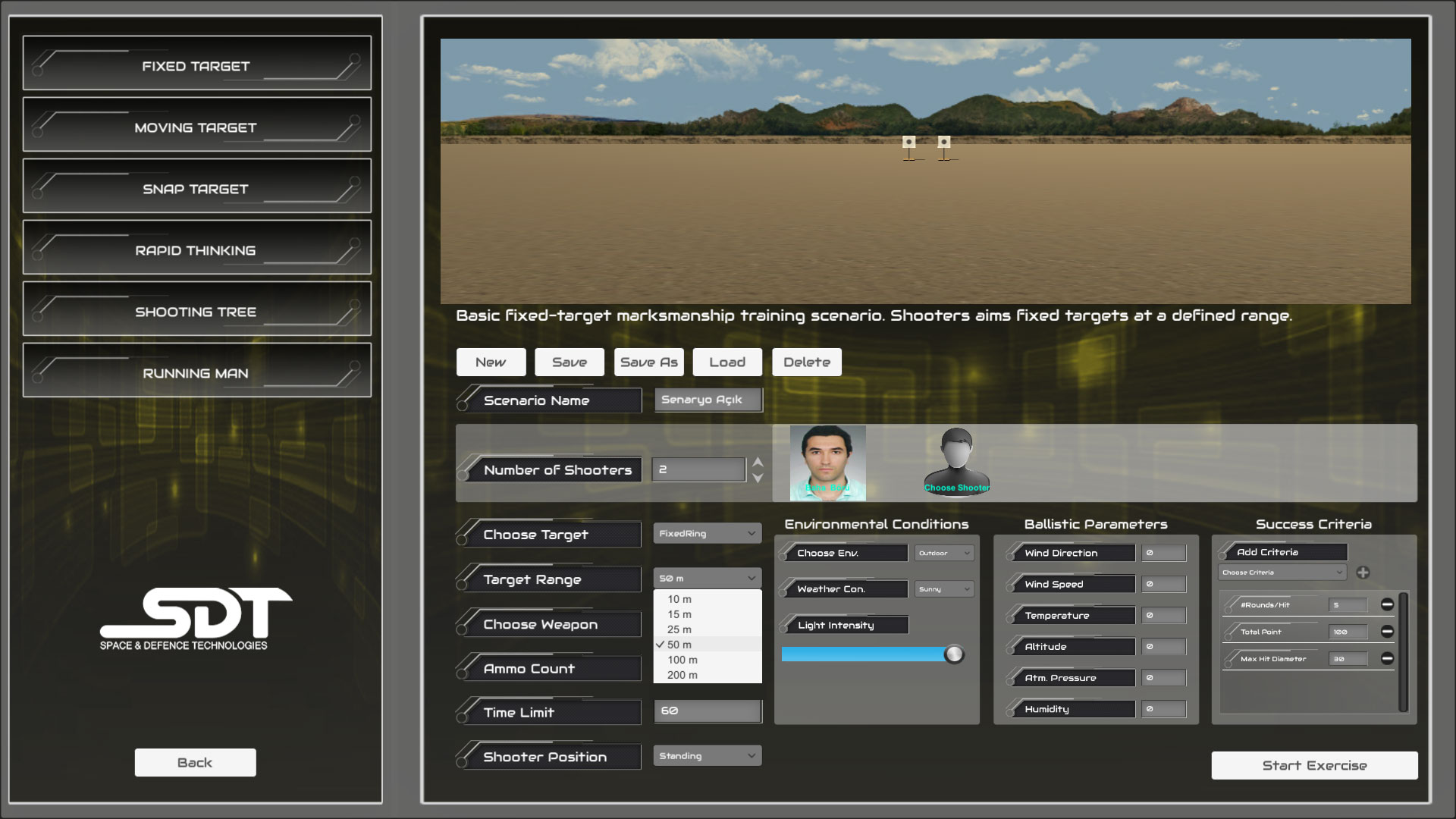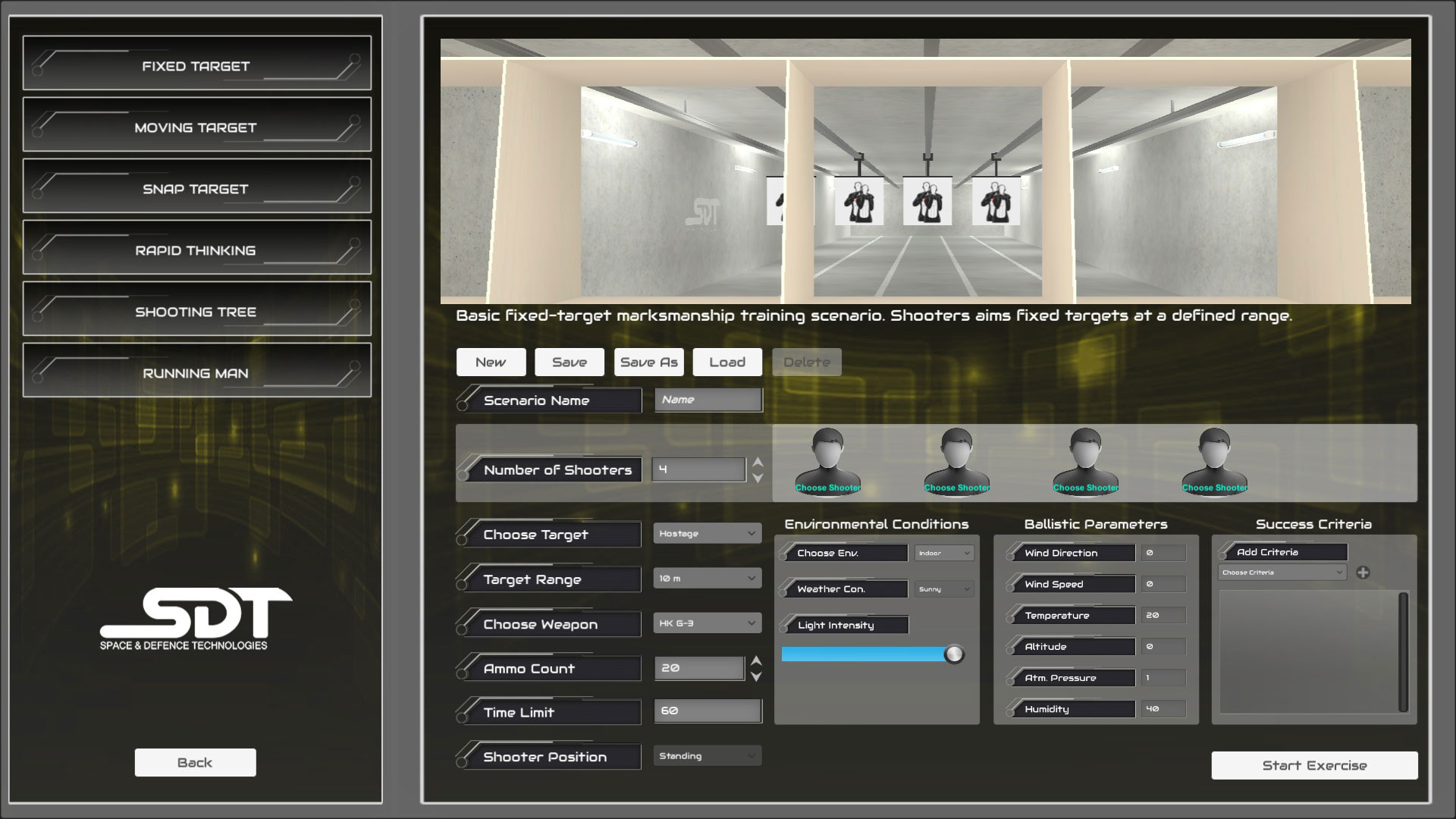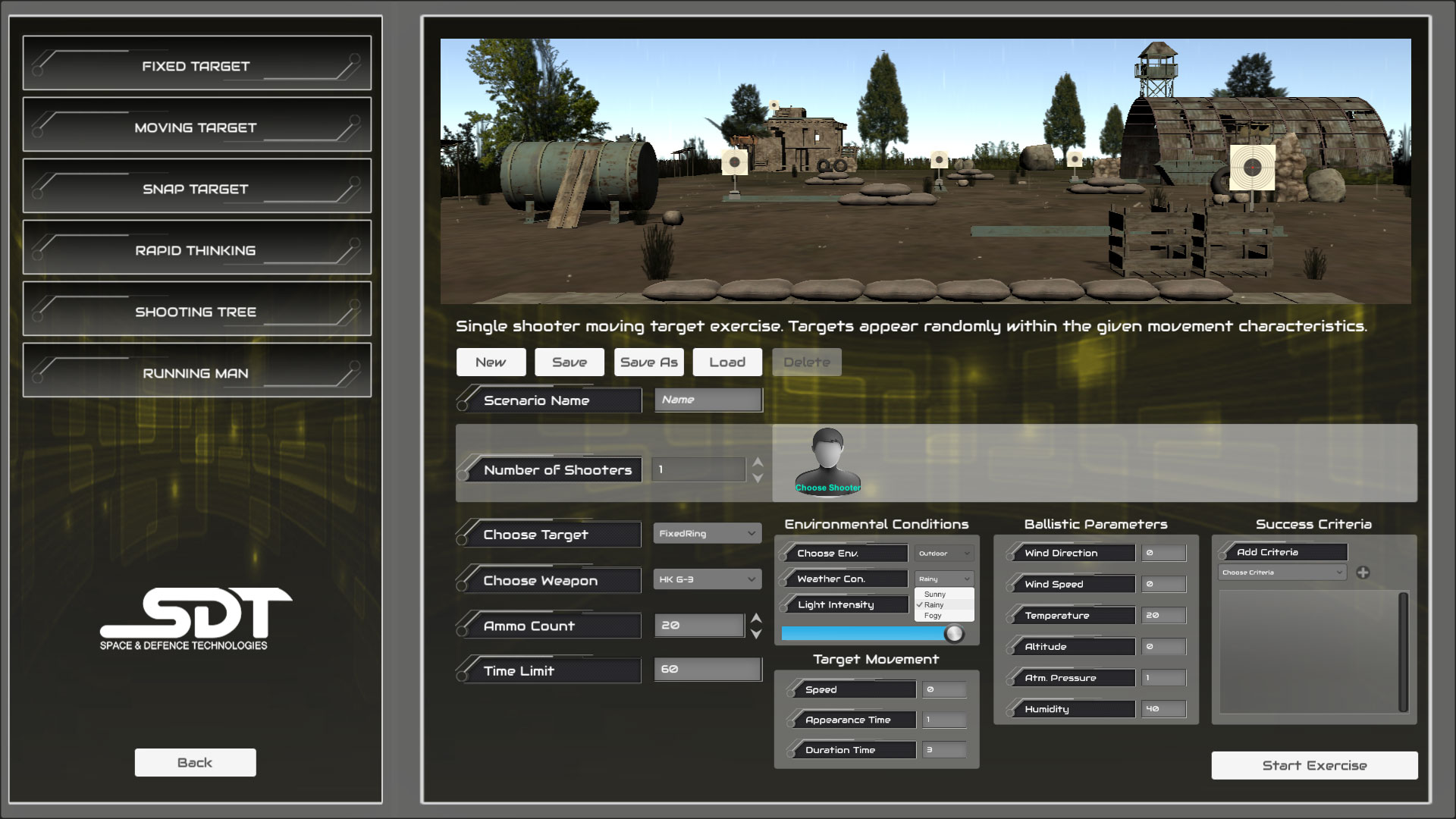 Editable scenario content in a range of trainees, targets, duration, weapons, environmental conditions, ballistics and success criterias.