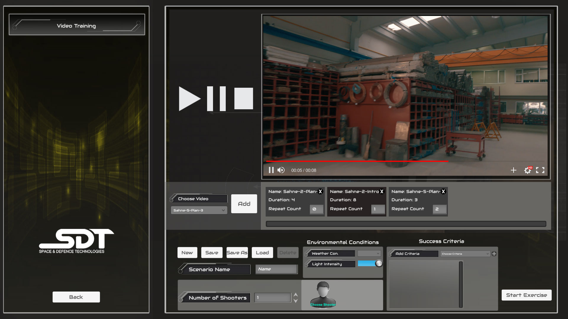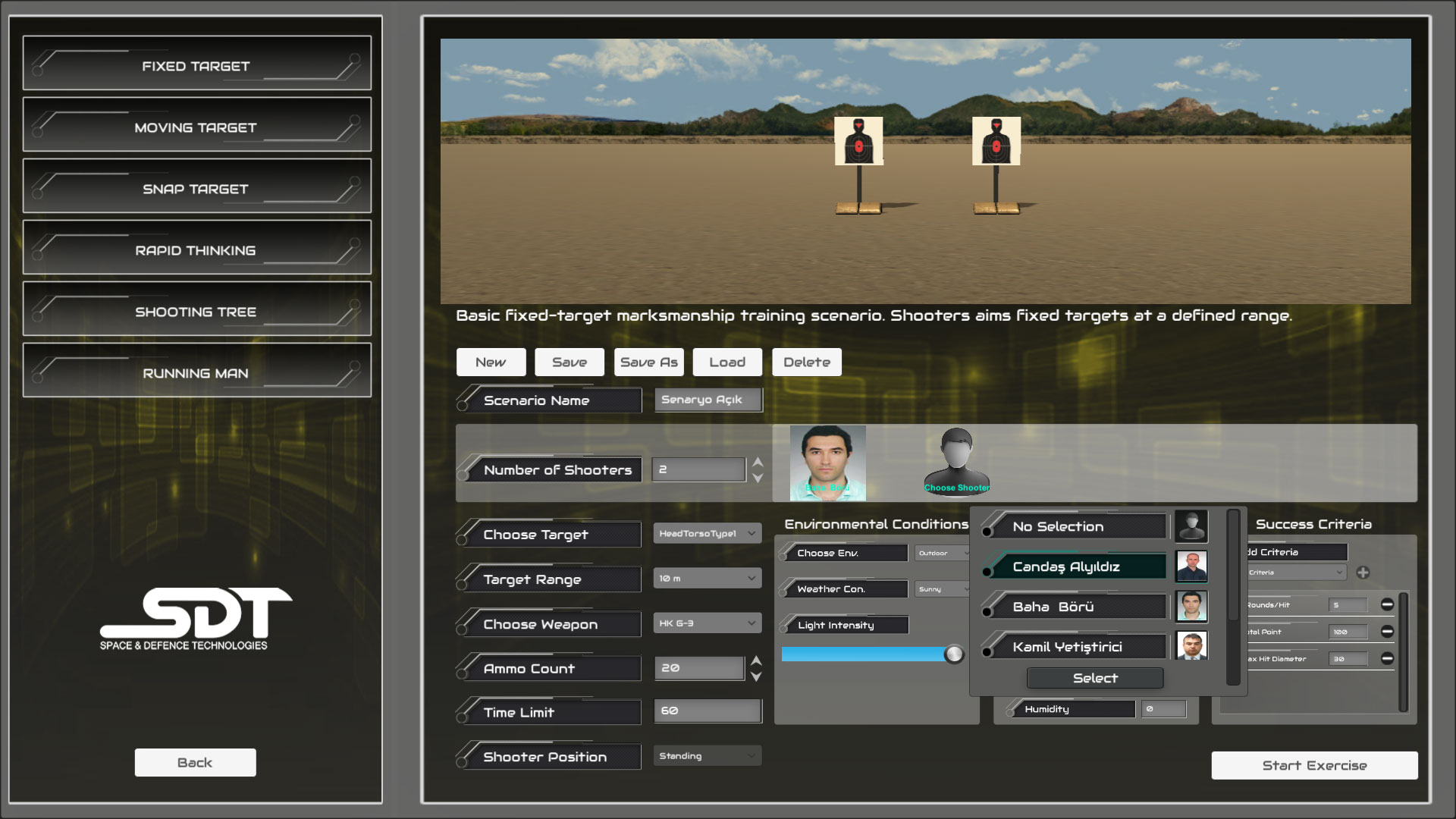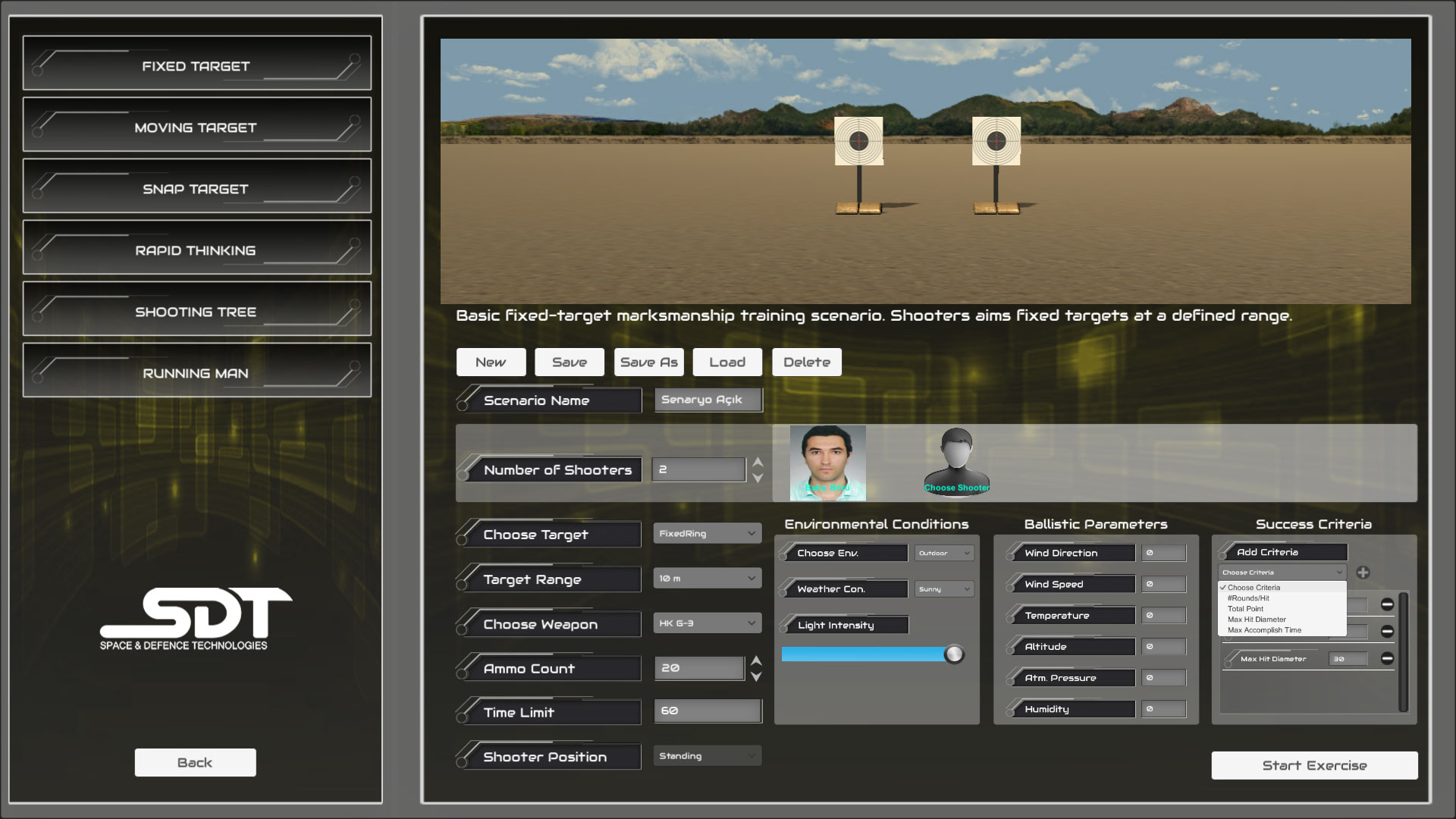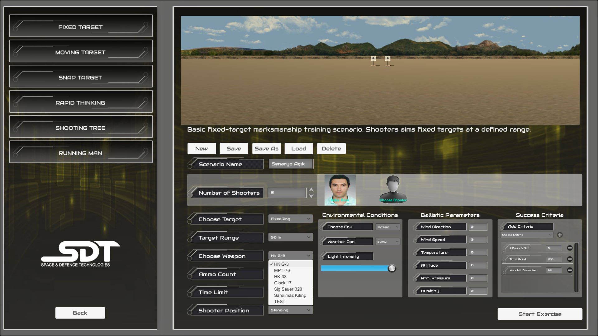 Editable scenario content in a range of trainees, targets, duration, weapons, environmental conditions, ballistics and success criterias.